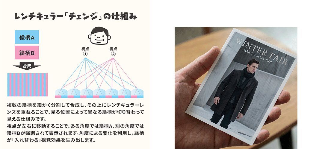 レンチキュラー チェンジは、細かなレンズ状のシート(レンチキュラーレンズ)越しに見ることで、見る角度によって2枚以上の絵柄が切り替わって見える加工です。画像を細い帯状に組み合わせ、レンズのピッチに合わせて精密に位置を合わせることで成立します。