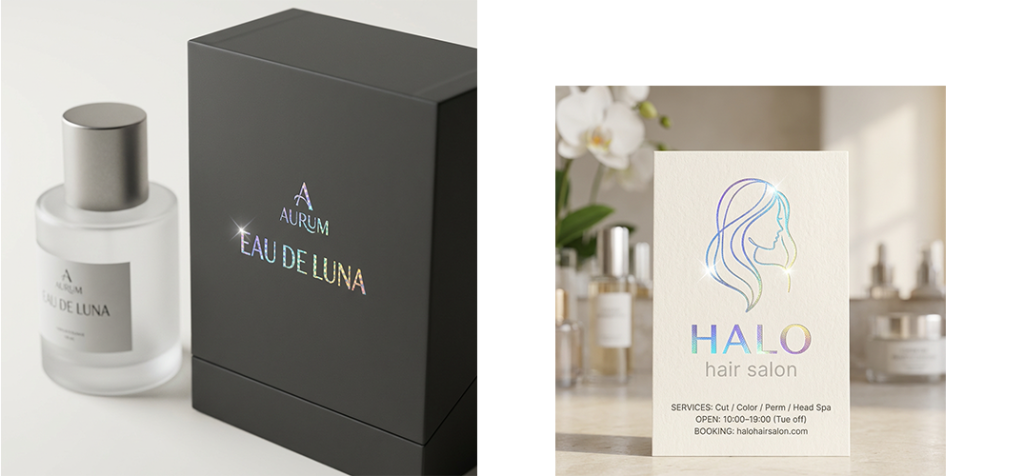 - 名刺・ショップカードのアクセント:全面よりも、ロゴやアイコンなど狙った一部だけに使うと上品にまとまります。
